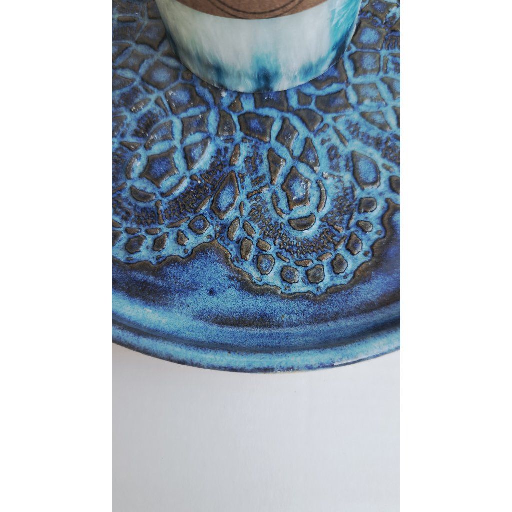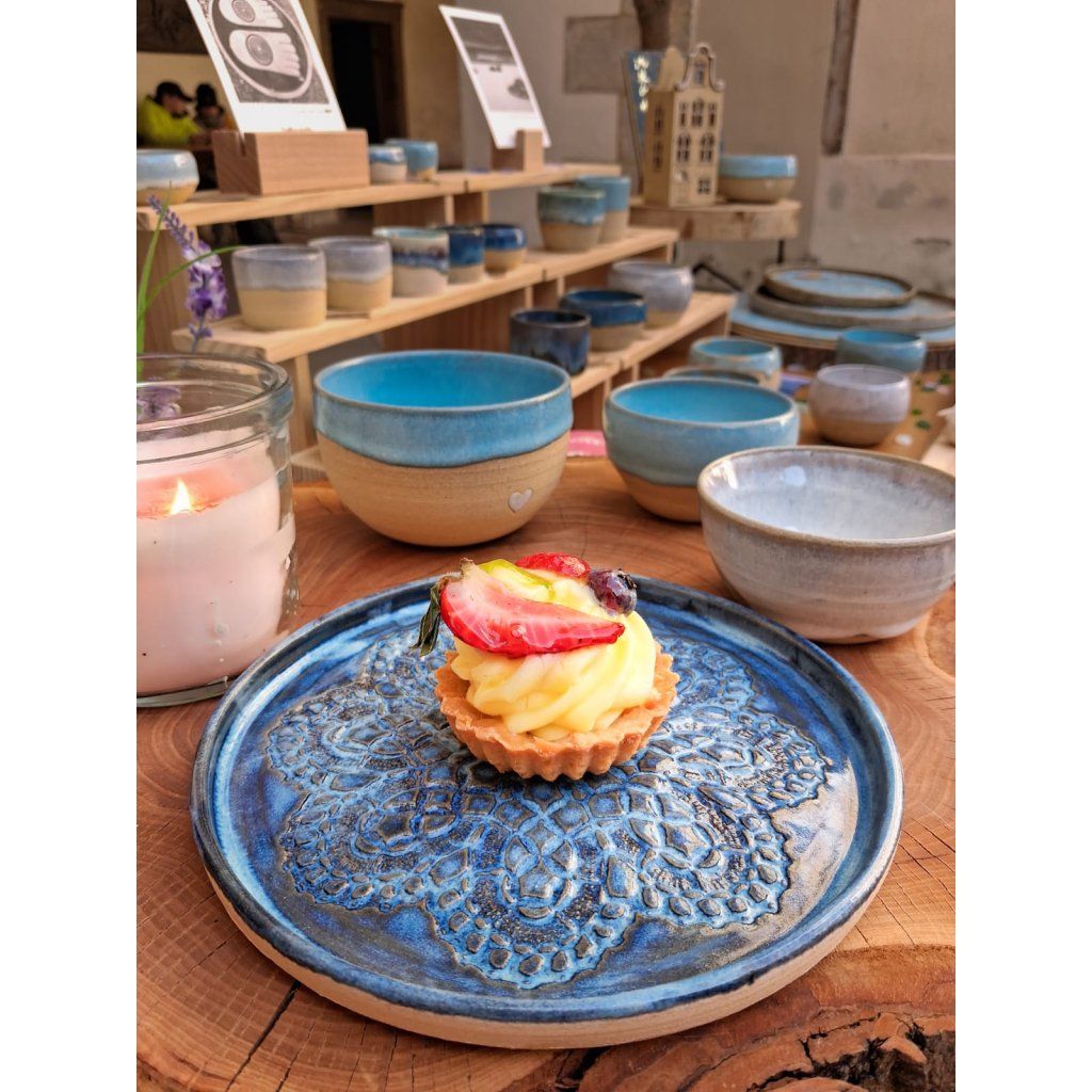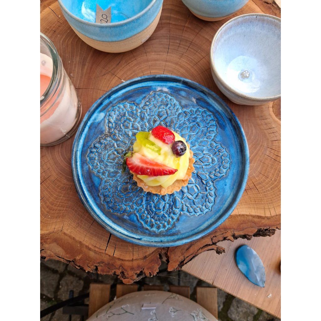 Tmavě modrý talíř s ornamentem krajky je vyrobený z kvalitní keramické hlíny pálené na vysokou teplotu přes 1200°C.